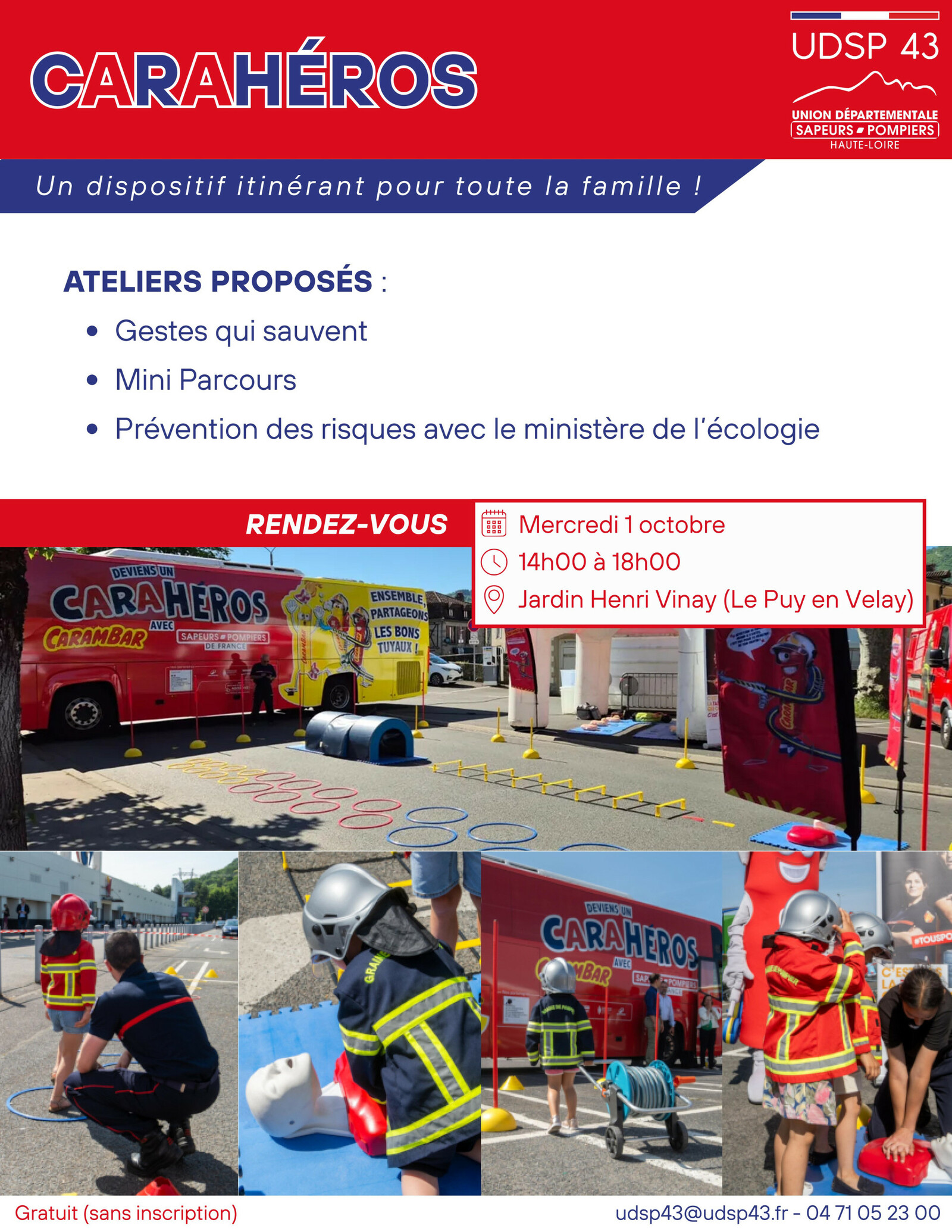 À cet effet, un bus "Carahéros" sillonne la France et fera un arrêt le mercredi 1er octobre de 14h à 18h dans le Jardin Henri Vinay, au Puy-en-Velay. Au cours de cet après-midi, plusieurs ateliers seront proposés :