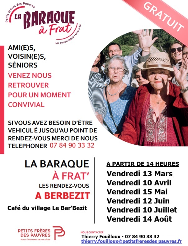 Les Petits Frères des Pauvres, association Loi 1901 à caractère laïque, reconnue d’utilité publique, luttent contre l’isolement et la solitude des personnes âgées, prioritairement les plus démunies. Ils souhaitent développer un réseau local de bénévoles visiteurs et lancer le dispositif « Baraque à Frat’ » sur notre territoire. (cf mail explicatif ci-dessous).