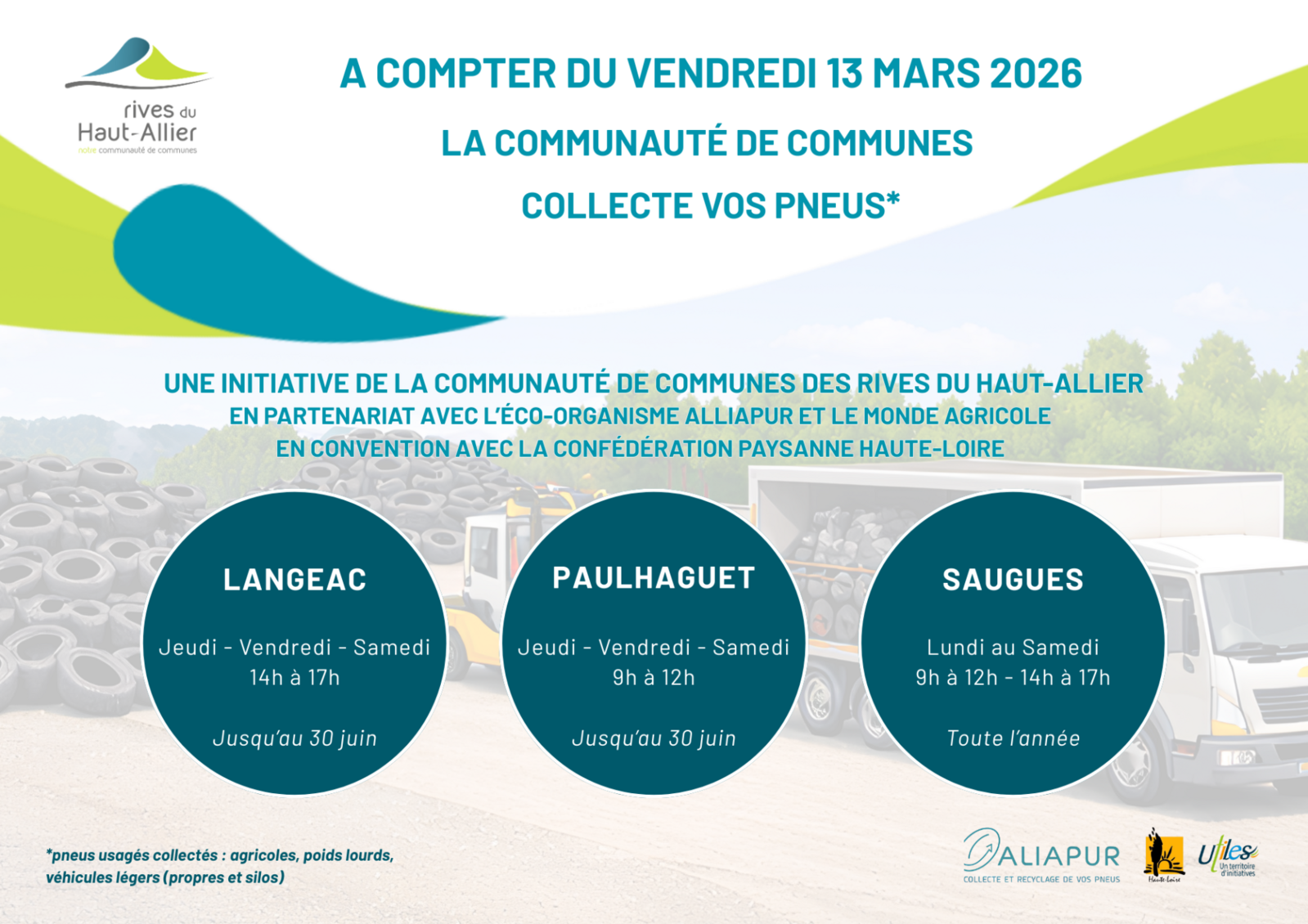 Dans le cadre de l’harmonisation des services de collecte et de traitement des déchets sur notre territoire, la CCRHA met en place à compter du 13 mars un dispositif dédié à la collecte et au traitement de tous les pneus usagés.